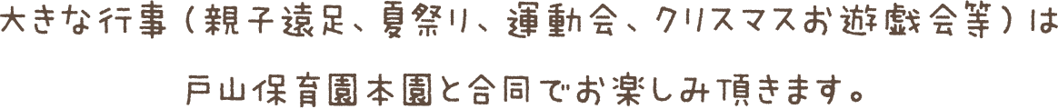 大きな行事(親子遠足、夏祭り、運動会、クリスマスお遊戯会等)は戸山保育園本園と合同でお楽しみ頂きます。
