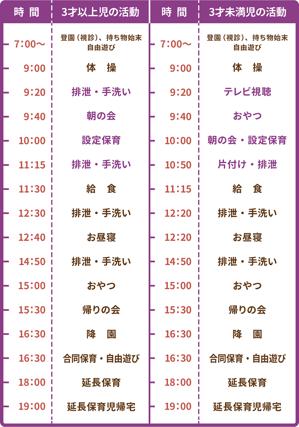 保育園での毎日の規則正しい生活は子どもたちの健康を守り、これから先の生活リズムの基盤をつくります。さらに、お友達と一緒に行動することで協調性を身につけます。 ※年齢によって一部活動内容が異なります。